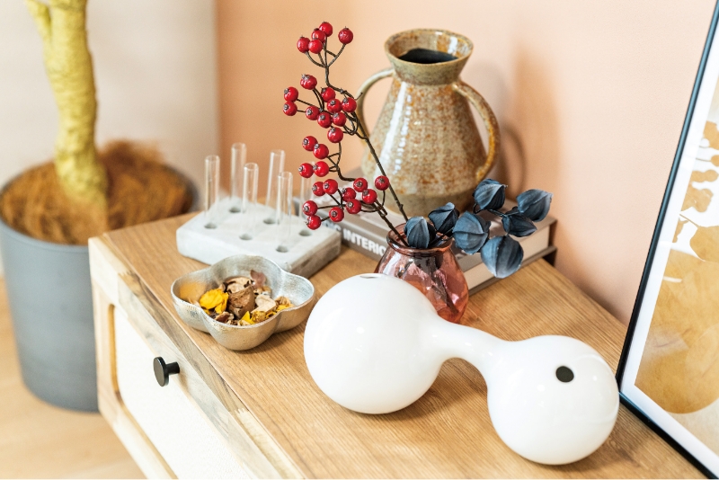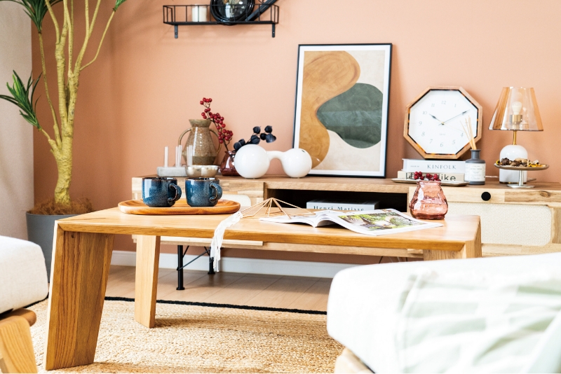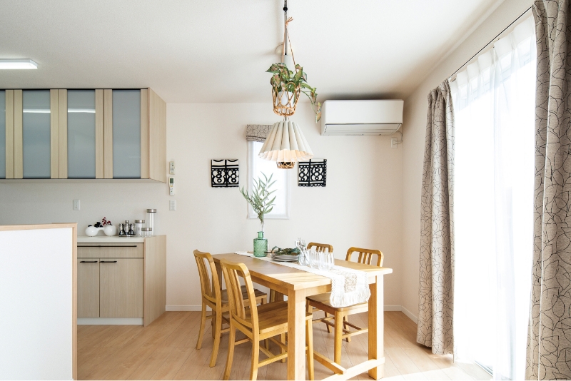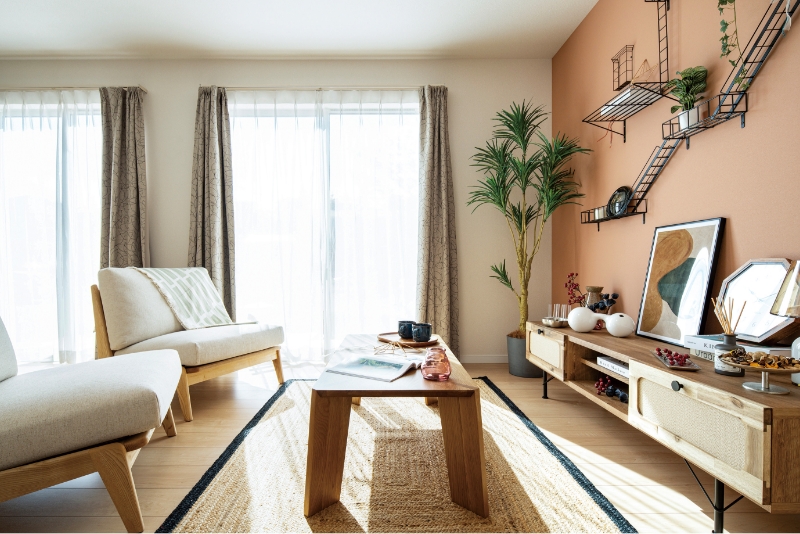 ラテンのイメージを彷彿とするテラスのチェアとアクセントクロスのヴィヴィッドカラーにはウッドやラタン、ナチュラルで温もりのある素材を使用した家具や雑貨を選定。グリーンを多用することで自然を感じながらゆったりと寛げる空間を演出。