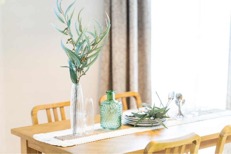 ラテンのイメージを彷彿とするテラスのチェアとアクセントクロスのヴィヴィッドカラーにはウッドやラタン、ナチュラルで温もりのある素材を使用した家具や雑貨を選定。グリーンを多用することで自然を感じながらゆったりと寛げる空間を演出。